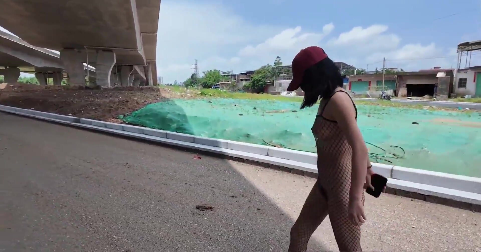 Popular internet celebrity exposed goddess [cikaimoon] on the streets of Guangxi. During the daytime when there were the most people, many young men saw a red hat and black net bodysuit seducing an old man on the roadside (1).