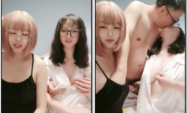 ผู้ชายใส่แว่นอึ๊บสาวสีชมพูน่ารักสองคนด้วยกัน แสดงใบหน้าของพวกเขาด้วยการแสดงอันเร่าร้อน...